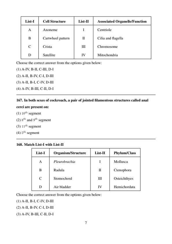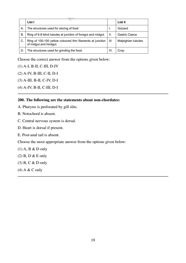 Conclusion: The correct answer is (4) A-IV, B-II, C-III, D-I. Quick Tip: In cockroaches, the crop stores food, the gastric caeca secrete digestive enzymes, the Malpighian tubules excrete nitrogenous waste, and the gizzard grinds food into smaller particles for digestion.