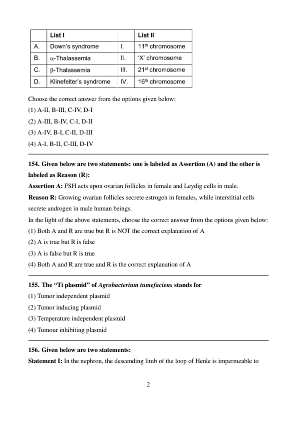 - The correct matching is A-III, B-IV, C-I, D-II, which corresponds to Option (2). Quick Tip: - Down’s Syndrome is caused by trisomy of chromosome 21. - \(\alpha\)-Thalassemia is linked to mutations in chromosome 16. - \(\beta\)-Thalassemia is caused by mutations in the HBB gene on chromosome 11. - Klinefelter’s Syndrome results from an extra X chromosome (XXY karyotype).