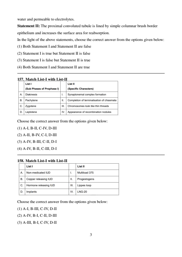 - The correct matching is A-II, B-IV, C-I, D-III, which corresponds to Option (2). Quick Tip: - Leptotene: Chromosomes appear as thin threads. - Zygotene: Synapsis begins with synaptonemal complex formation. - Pachytene: Recombination nodules appear, leading to crossing over. - Diakinesis: Terminalization of chiasmata and movement of homologous chromosomes apart.