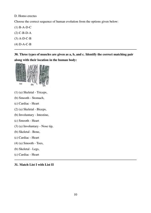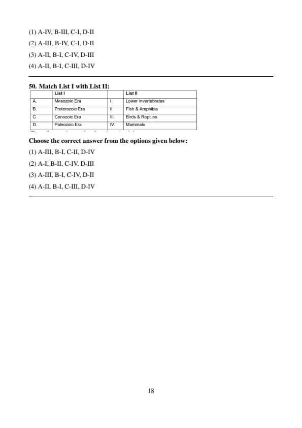 Conclusion: The correct answer is (3) A-III, B-I, C-IV, D-II. Quick Tip: The geological time scale classifies Earth's history into different eras. The \textbf{Proterozoic Era} saw early multicellular life, the \textbf{Paleozoic Era} was dominated by fish and amphibians, the \textbf{Mesozoic Era} was the age of reptiles and birds, and the \textbf{Cenozoic Era} saw the rise of mammals.