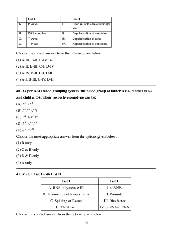 Conclusion: The correct answer is (3) A-IV, B-III, C-I, D-II. Quick Tip: RNA polymerase III transcribes snRNAs and tRNA, the Rho factor terminates transcription, snRNPs assist in splicing, and the TATA box is a crucial promoter sequence for gene expression.