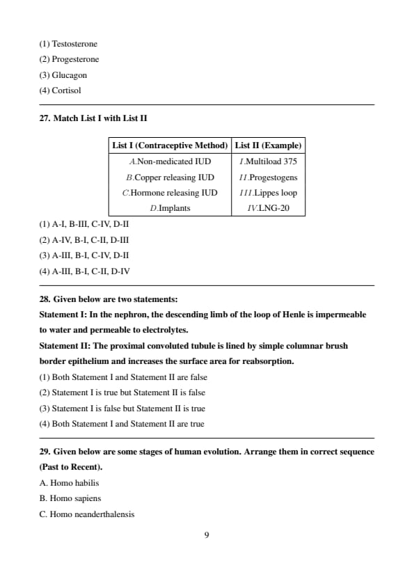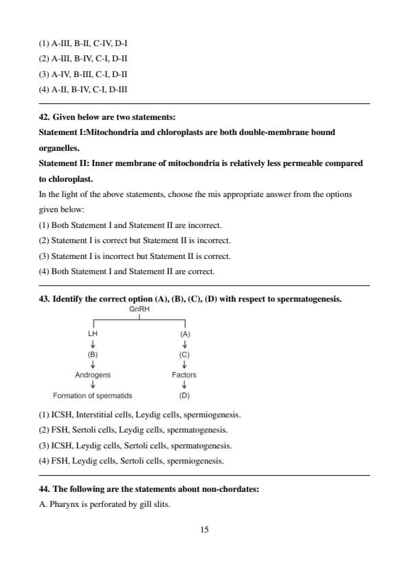 Conclusion: Since A states that FSH acts on Leydig cells (which is incorrect), the correct answer is \( \mathbf{(3)} \). Quick Tip: \textbf{FSH acts on Sertoli cells, while LH (Luteinizing Hormone) acts on Leydig cells to stimulate testosterone production.}
