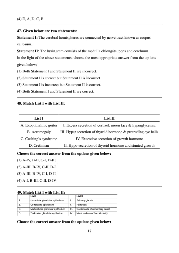 Conclusion: The correct option is (3). Quick Tip: \textbf{Hormonal imbalances can lead to distinct disorders; thyroid hormones affect metabolism, while cortisol and growth hormone regulate stress and growth.}