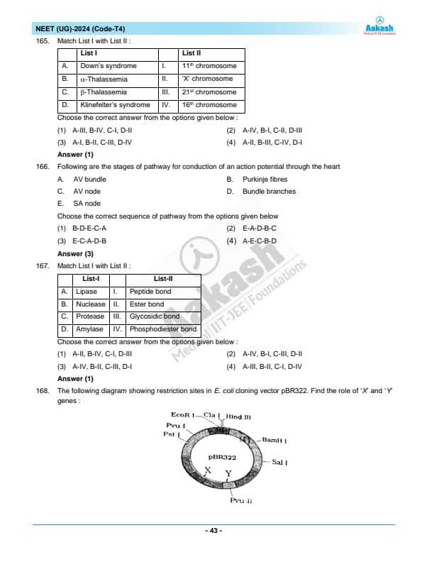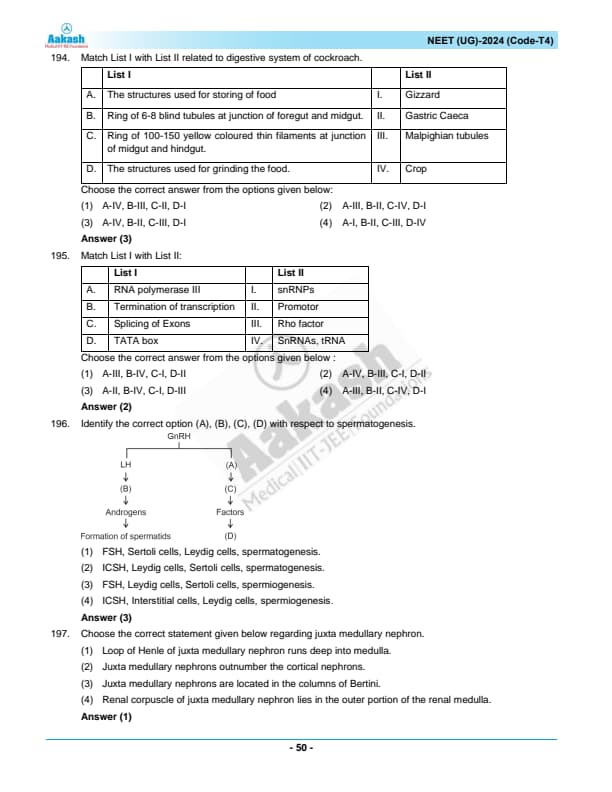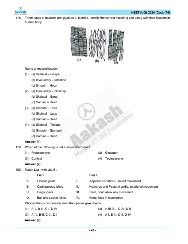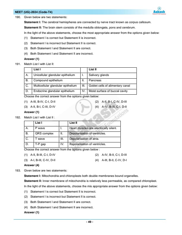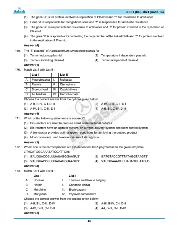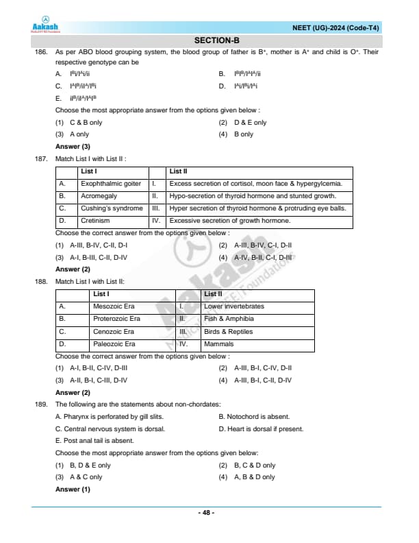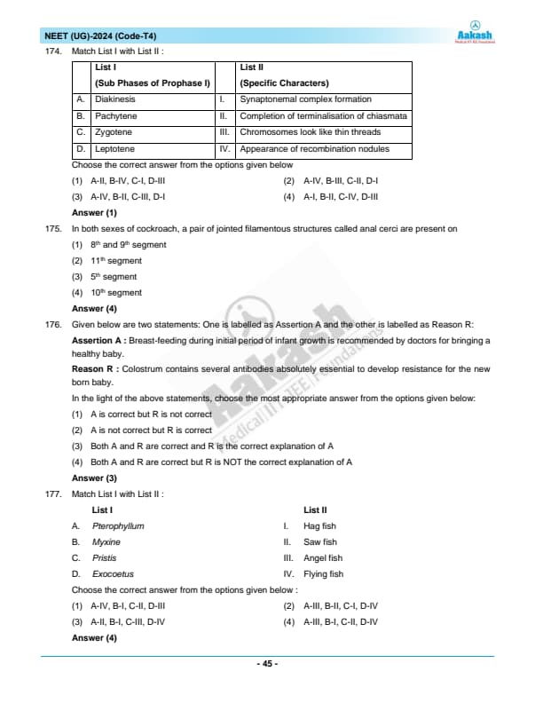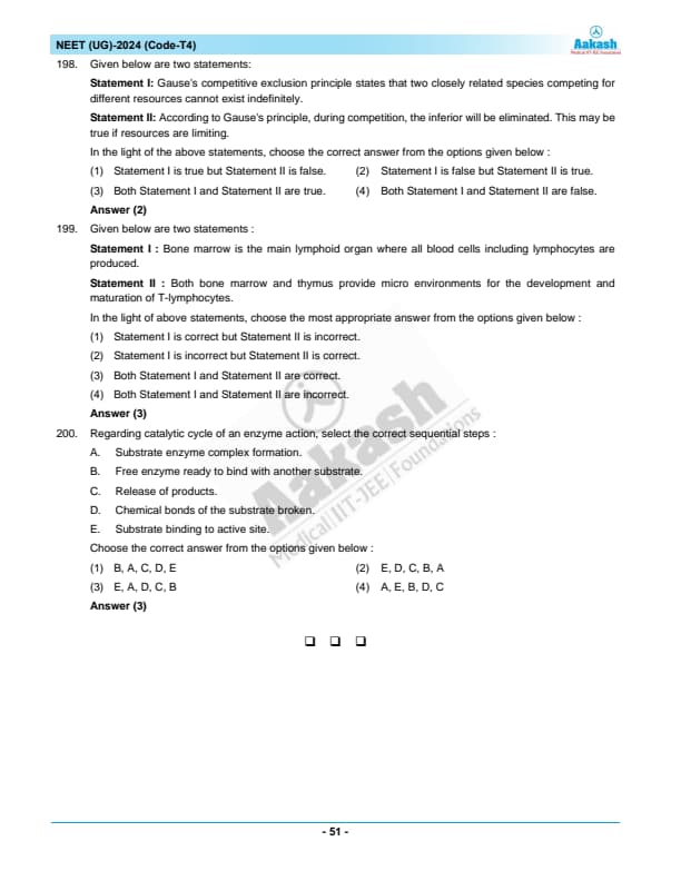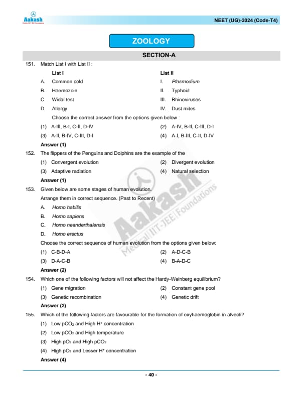 NEET 2024 Zoology Question Paper with Solutions PDF T4 is available for download. NEET 2024 T4 Zoology Question Paper comprises 50 MCQs out of which only 45 are to be attempted. NEET 2024 question T4 Zoology is divided into 2 sections- A (35 questions) and B (15 questions). You can download NEET 2024 zoology question paper with answer key and solutions PDF for T4 using the links given below. [PDF Source: aakash.ac.in]