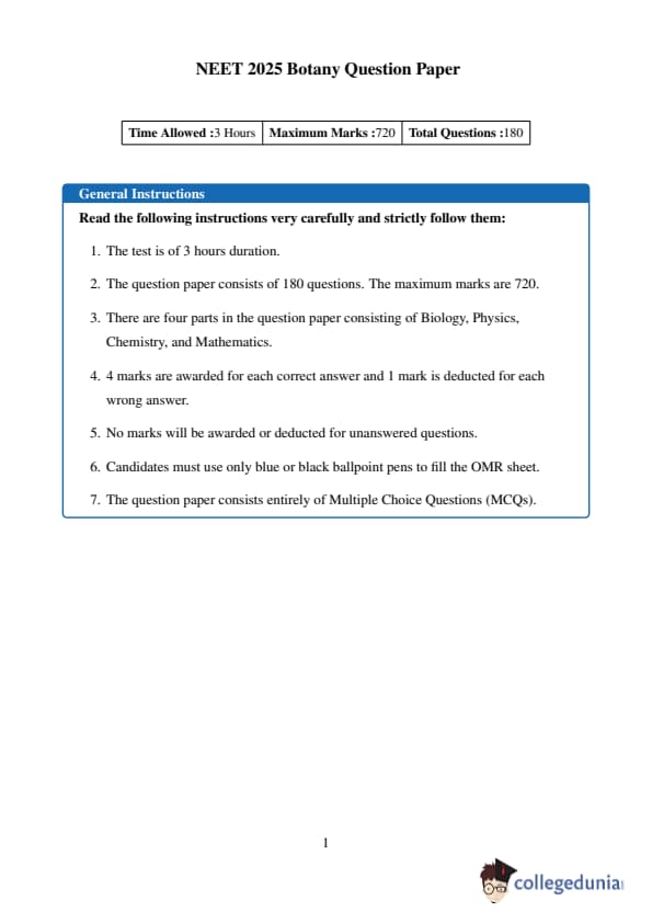 NEET 2025 Botany Question Paper with Solutions PDF is available for download. NEET 2025 Botany Question Paper comprises 45 MCQs. NEET 2025 has been conducted on May 4, 2025. You can download NEET 2025 Botany question paper with answer key and solutions PDF using the links given below.