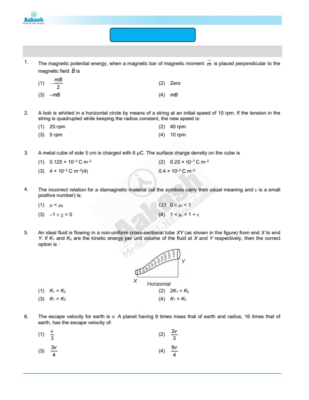 The magnetic potential energy, when a magnetic bar of magnetic moment \( \mathbf{m} \) is placed perpendicular to the magnetic field \( \mathbf{B} \), is: