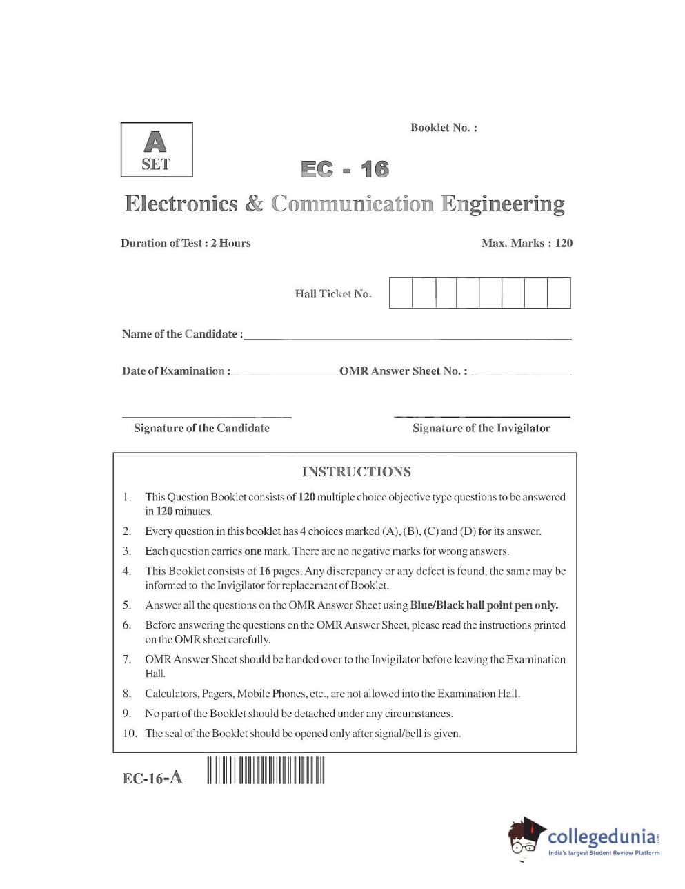 AP PGECET 2016 Electronics and Communication Engineering Question paper with answer key pdf is available for download. The exam was successfully organized by Jawaharlal Nehru Technological University, Kakinada (JNTUK). The question paper comprised a total of 120 questions.
