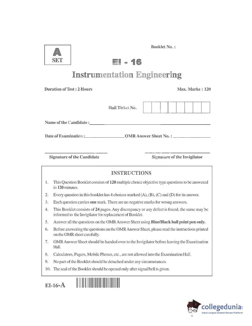 AP PGECET 2016 Instrumentation Engineering Question paper with answer key pdf is available for download. The exam was successfully organized by Jawaharlal Nehru Technological University, Kakinada (JNTUK). The question paper comprised a total of 120 questions.