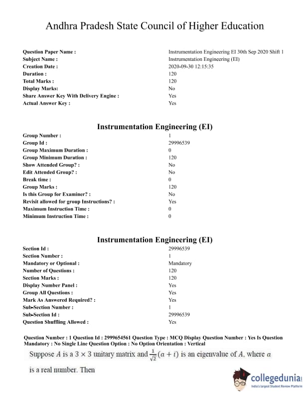 AP PGECET 2020 Instrumentation Engineering Question paper with answer key pdf conducted on September 30, 2020 in Forenoon Session 10 AM to 12 PM is available for download. The exam was successfully organized by Andhra University. The question paper comprised a total of 120 questions.