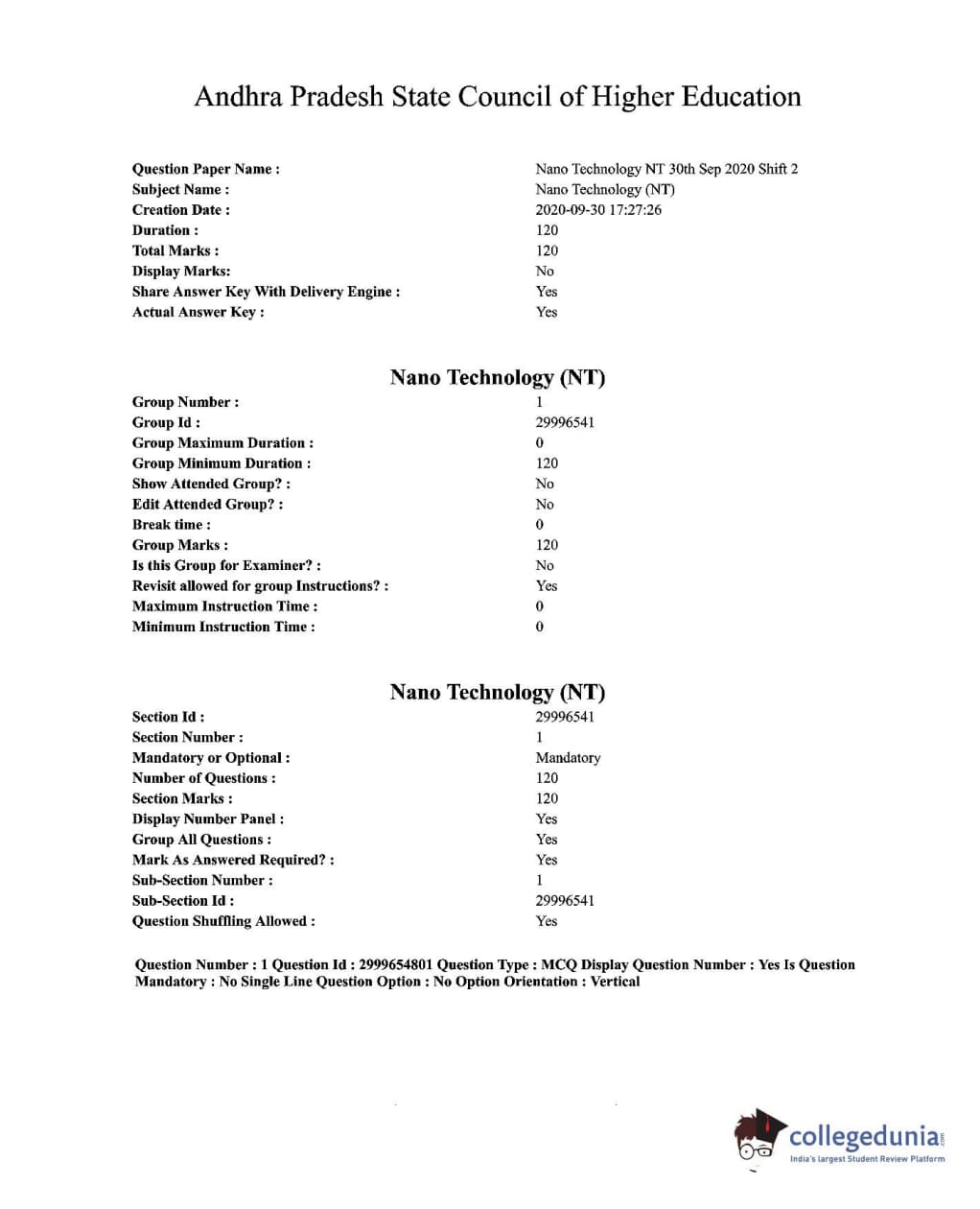 AP PGECET 2020 Nano Technology Question paper with answer key pdf conducted on September 30, 2020 in Afternoon Session 3 PM to 5 PM is available for download. The exam was successfully organized by Andhra University. The question paper comprised a total of 120 questions.