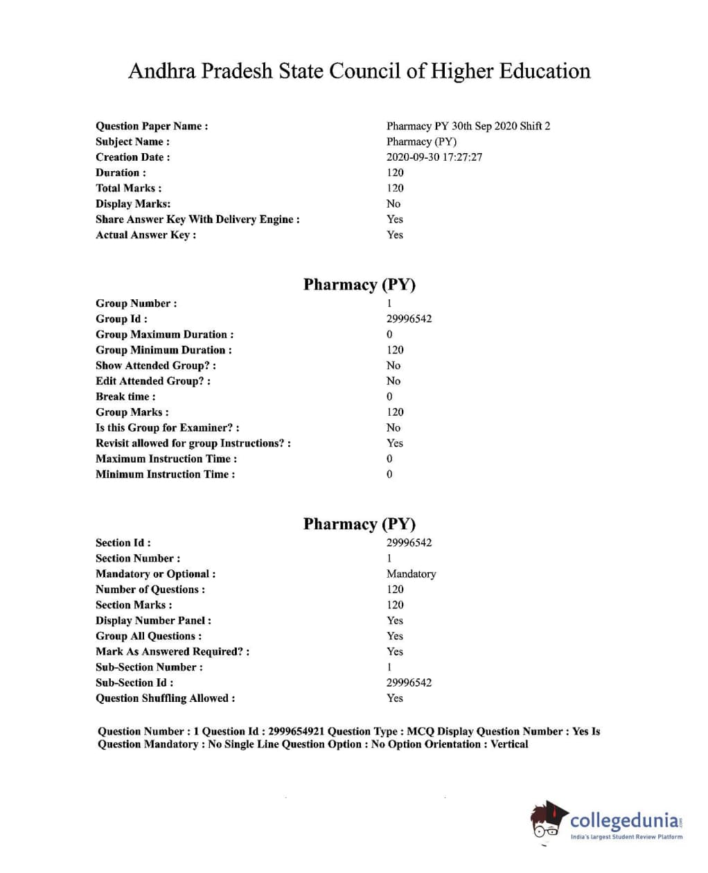 AP PGECET 2020 Pharmacy Question paper with answer key pdf conducted on September 30, 2020 in Afternoon Session 3 PM to 5 PM is available for download. The exam was successfully organized by Andhra University. The question paper comprised a total of 120 questions.