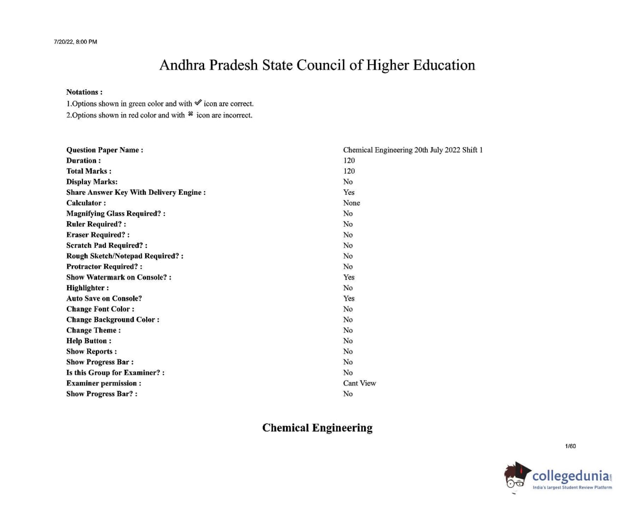 AP PGECET 2022 Chemical Engineering Question Paper with Answer Key pdf is available for download. The exam was conducted by Sri Venkateswara University, Tirupati on July 20, 2022 in Shift 1. The question paper comprised a total of 120 questions.