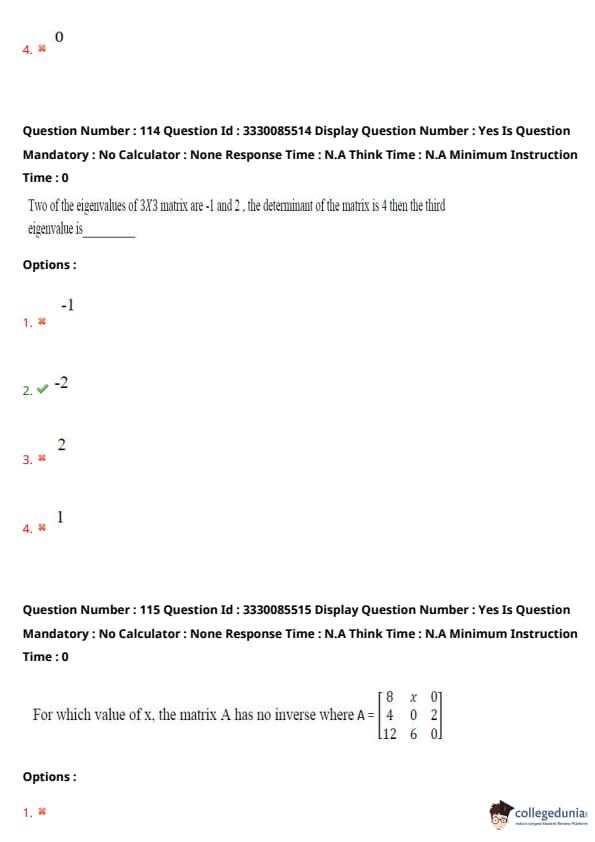 Therefore, the third eigenvalue is **-2**. Quick Tip: The determinant of a matrix is the product of its eigenvalues. If you know the determinant and some eigenvalues, you can solve for the remaining eigenvalues.