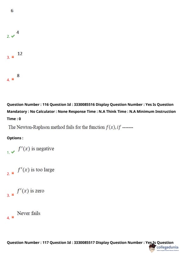 Therefore, the correct answer is **(3) \( f'(x) \) is zero**. Quick Tip: Always check the derivative when applying the Newton-Raphson method. If the derivative is zero at any point, the method cannot be used at that point.