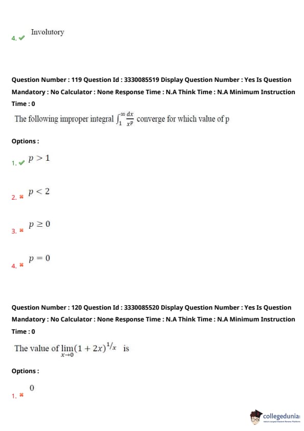 Thus, the correct answer is **(1) \( p > 1 \)**. Quick Tip: Improper integrals involving powers of \( x \) converge when the exponent is greater than (1) Always check the condition for convergence based on the exponent in the integrand.