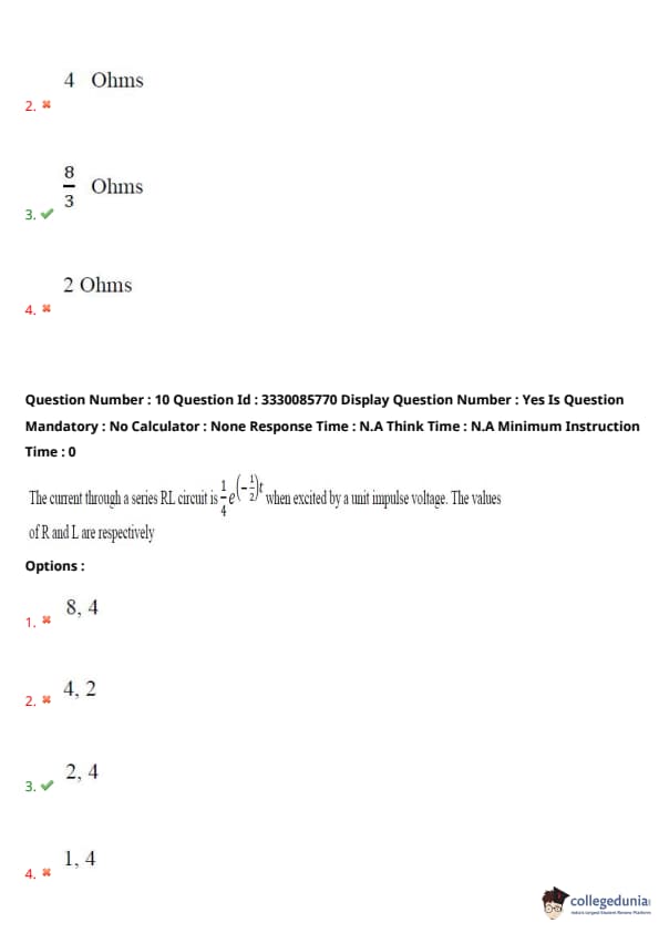 The current through a series RL circuit is \( \frac{1}{4} e^{-\frac{3}{4} t} \) when excited by a unit impulse voltage. The values of R and L are respectively