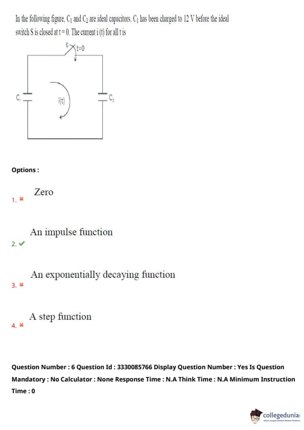 In the following figure, \(C_1\) and \(C_2\) are ideal capacitors. \(C_1\) has been charged to 12V before the ideal switch \(S\) is closed at \(t = 0\). The current \(i(t)\) for all \(t\) is