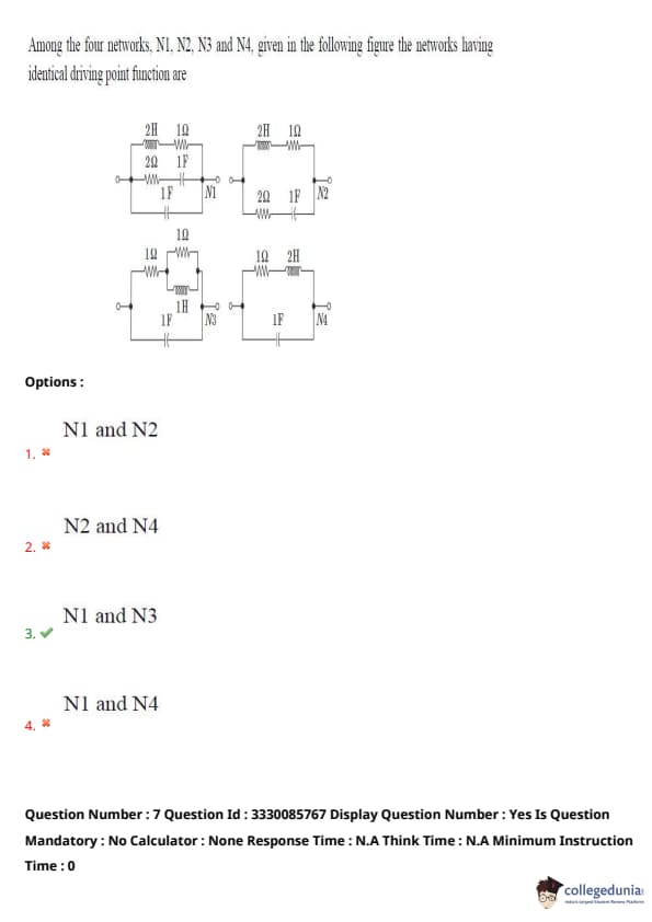 Among the four networks, N1, N2, N3, and N4, given in the following figure, the networks having identical driving point function are