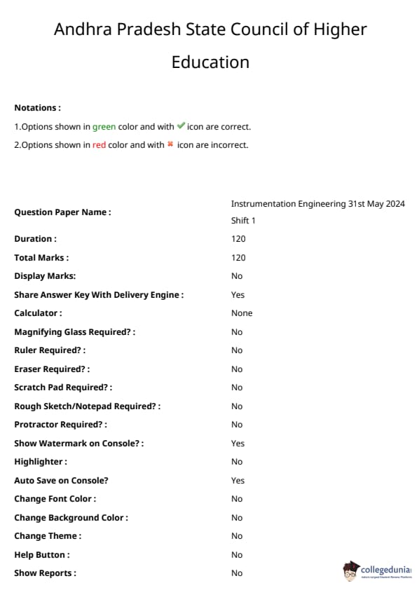 AP PGECET 2024 Instrumentation Engineering Question Paper is available for download here. Sri Venkateswara University, Tirupati on behalf of APSCHE conducted AP PGECET 2024 Instrumentation Engineering on May 31 in Shift 1 from 9 AM to 11 AM. AP PGECET Question Paper 2024 consists of 120 MCQ-based questions in total carrying 1 mark each to be attempted in the duration of 2 hours.