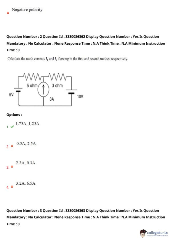 Question 2: Calculate the mesh currents \(I_1\) and \(I_2\) flowing in the first and second meshes respectively.