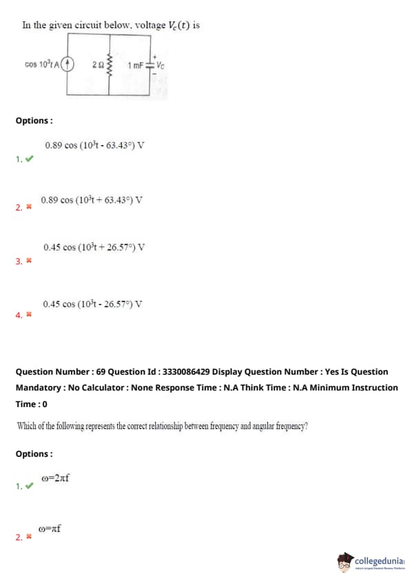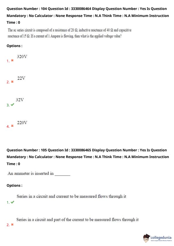 Question 104: The ac series circuit is composed of a resistance of 20 \(\Omega\), inductive reactance of 40 \(\Omega\) and capacitive reactance of 15 \(\Omega\). If a current of 1 Ampere is flowing, then what is the applied voltage value?