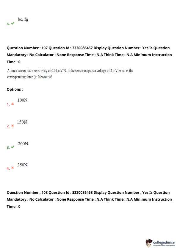 Question 107: A force sensor has a sensitivity of 0.01 mV/N. If the sensor outputs a voltage of 2 mV, what is the corresponding force (in Newtons)?