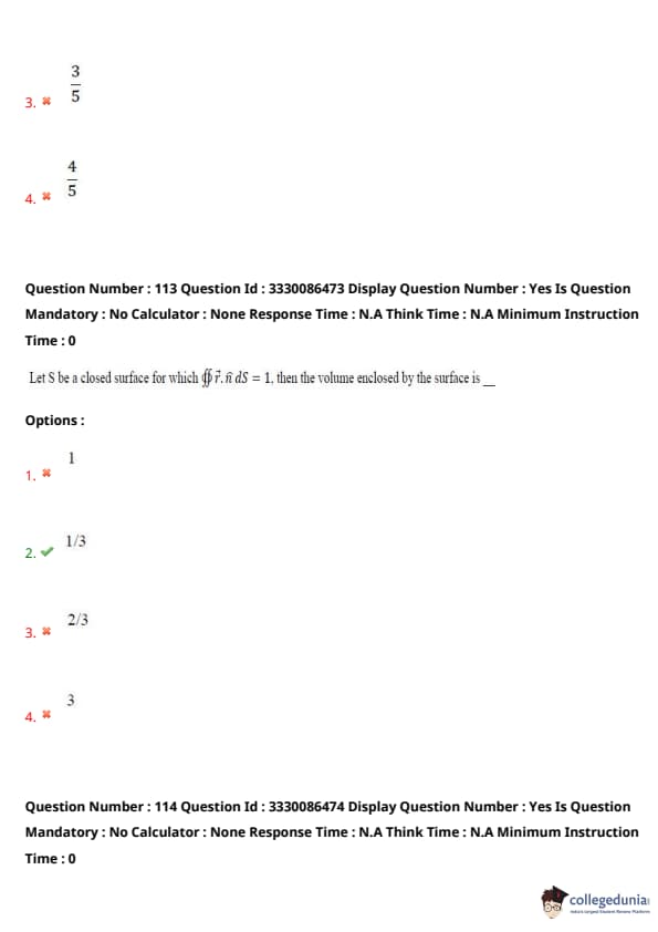 Question 113: Let S be a closed surface for which \( \oiint_S \vec{r} \cdot \hat{n} \, dS = 1 \), then the volume enclosed by the surface is __________________.