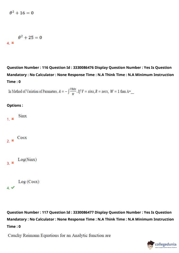 Question 115: Auxiliary Equation for the Cauchy Euler Equation \( (x^2 D^2 + xD + 4)y = 0 \) is \underline{\hspace{2cm