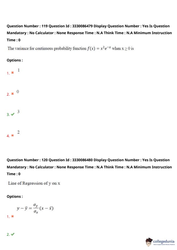 Question 119: The variance for continuous probability function \( f(x) = x^2 e^{-x} \) when \( x \ge 0 \) is