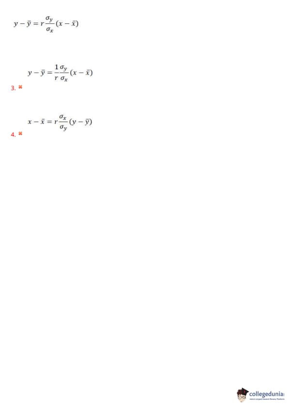 - (4) \( x - \bar{x} = r \frac{\sigma_x}{\sigma_y} (y - \bar{y}) \)