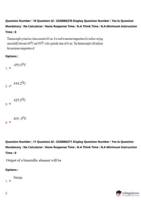 Question 10: Thermocouple system has a time constant of 8 sec. It is used to measure temperature of a surface varying sinusoidally between 400\(^\circ\)C and 450\(^\circ\)C with a periodic time of 60 sec. The thermocouple will indicate the maximum temperature of