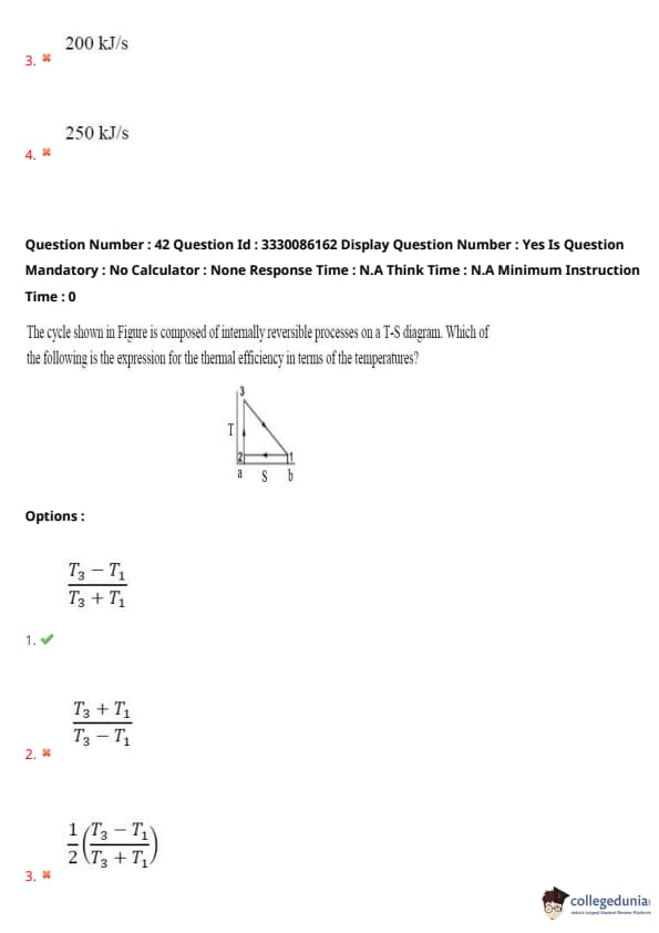 The cycle shown in Figure is composed of internally reversible processes on a T-S diagram. Which of the following is the expression for thermal efficiency in terms of the temperatures?