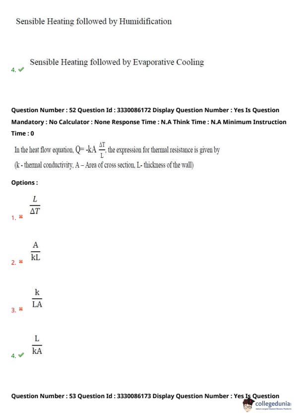 In the heat flow equation, \( Q = -kA \frac{\Delta T}{L} \), the expression for thermal resistance is given by (k - thermal conductivity, A - Area of cross section, L - thickness of the wall)