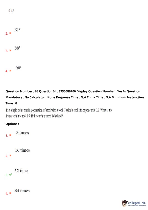 In a single point turning operation of steel with a tool, Taylor’s tool life exponent is 0.2. What is the increase in the tool life if the cutting speed is halved?
