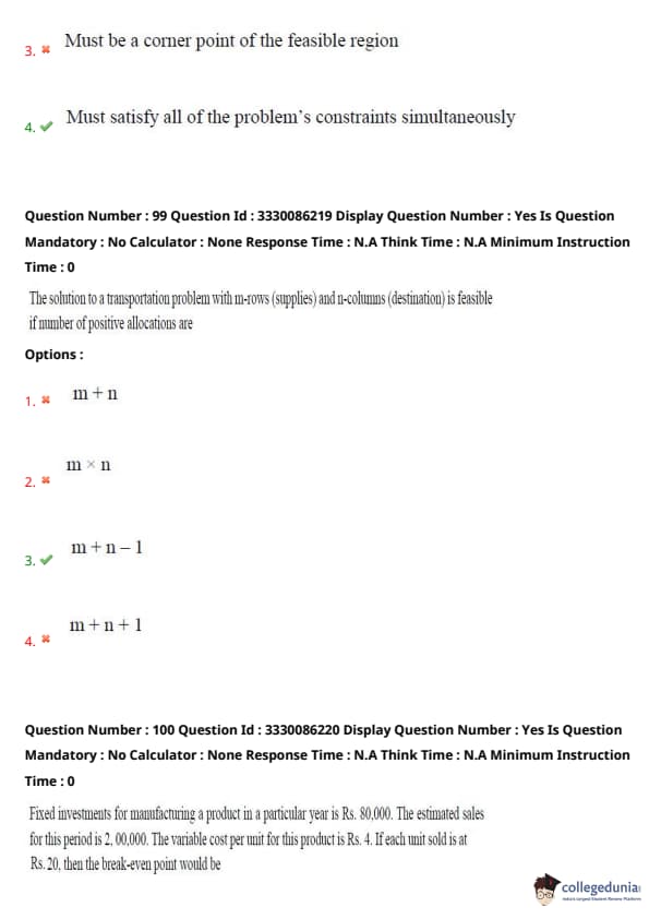 The solution to a transportation problem is a basic feasible solution if the number of positive allocations is \( m + n - 1 \), matching option (3). Quick Tip: In a transportation problem, a basic feasible solution has \( m + n - 1 \) positive allocations, corresponding to the number of independent constraints (supply and demand equations minus one redundancy).