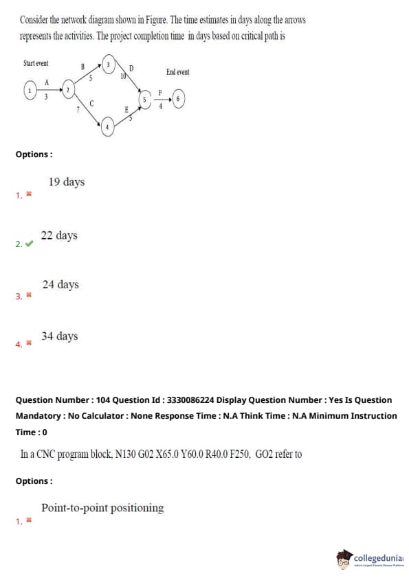 Consider the network diagram shown in Figure. The time estimates in days along the arrows represents the activities. The project completion time in days based on critical path is