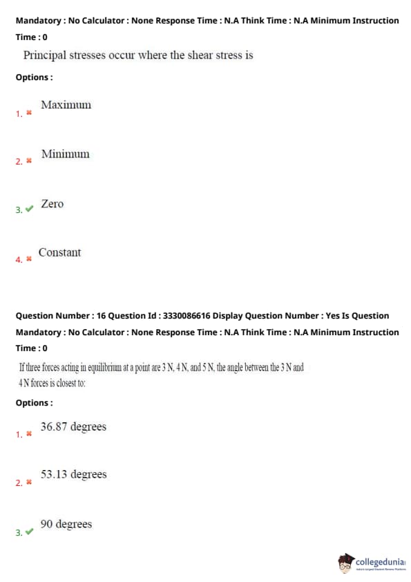 Question 16: If three forces acting in equilibrium at a point are 3 N, 4 N, and 5 N, the angle between the 3 N and 4 N forces is closest to: