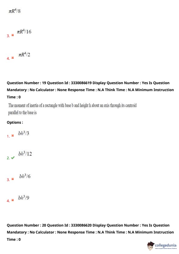 Question 19: The moment of inertia of a rectangle with base b and height h about an axis through its centroid parallel to the base is