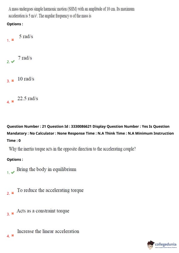 Question 20: A mass undergoes simple harmonic motion (SHM) with an amplitude of 10 cm. Its maximum acceleration is 5 m/s\(^2\). The angular frequency \(\omega\) of the mass is