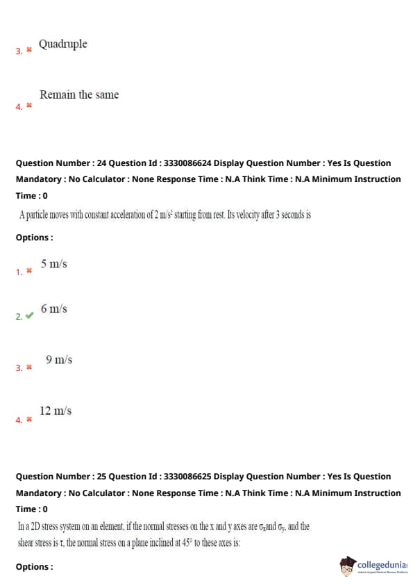 Question 24: A particle moves with constant acceleration of 2 m/s\(^2\) starting from rest. Its velocity after 3 seconds is