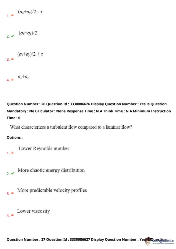 Question 25: In a 2D stress system on an element, if the normal stresses on the x and y axes are \(\sigma_x\) and \(\sigma_y\), and the shear stress is \(\tau\) (\(\tau_{xy}\)), the normal stress on a plane inclined at 45\(^\circ\) to these axes is: