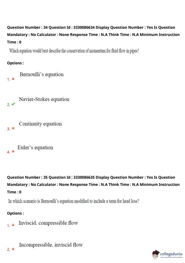 Question 34: Which equation would best describe the conservation of momentum for fluid flow in pipes?