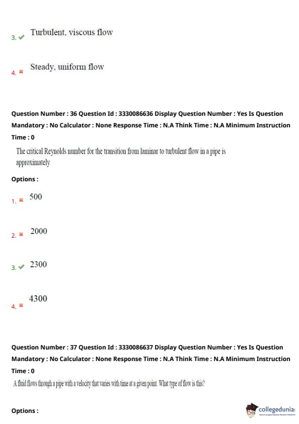 Question 36: The critical Reynolds number for the transition from laminar to turbulent flow in a pipe is approximately