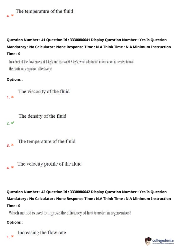 Question 41: In a duct, if the flow enters at 1 kg/s and exits at 0.5 kg/s, what additional information is needed to use the continuity equation effectively?
