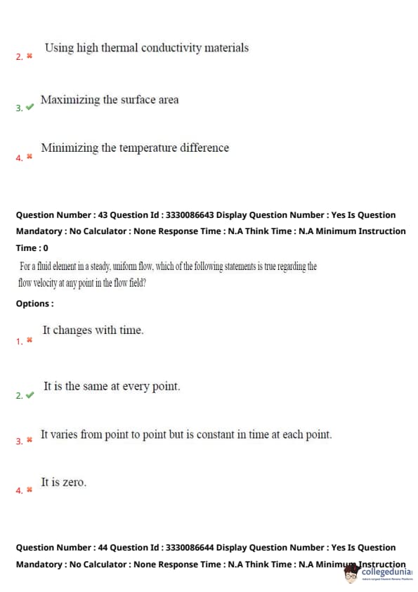 Question 43: For a fluid element in a steady, uniform flow, which of the following statements is true regarding the flow velocity at any point in the flow field?