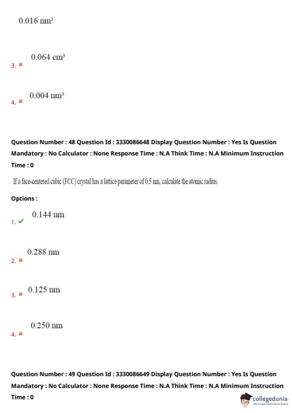 Question 48: If a face-centered cubic (FCC) crystal has a lattice parameter of 0.5 nm, calculate the atomic radius.