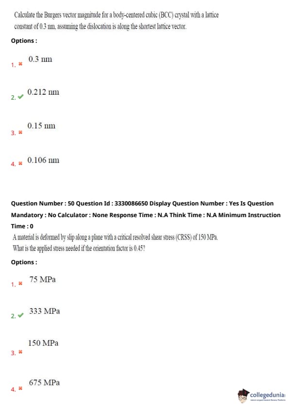 Question 50: A material is deformed by slip along a plane with a critical resolved shear stress (CRSS) of 150 MPa. What is the applied stress needed if the orientation factor is 0.45?