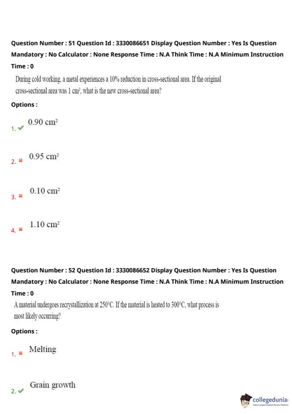 Question 51: During cold working, a metal experiences a 10% reduction in cross-sectional area. If the original cross-sectional area was 1 cm\(^2\), what is the new cross-sectional area?