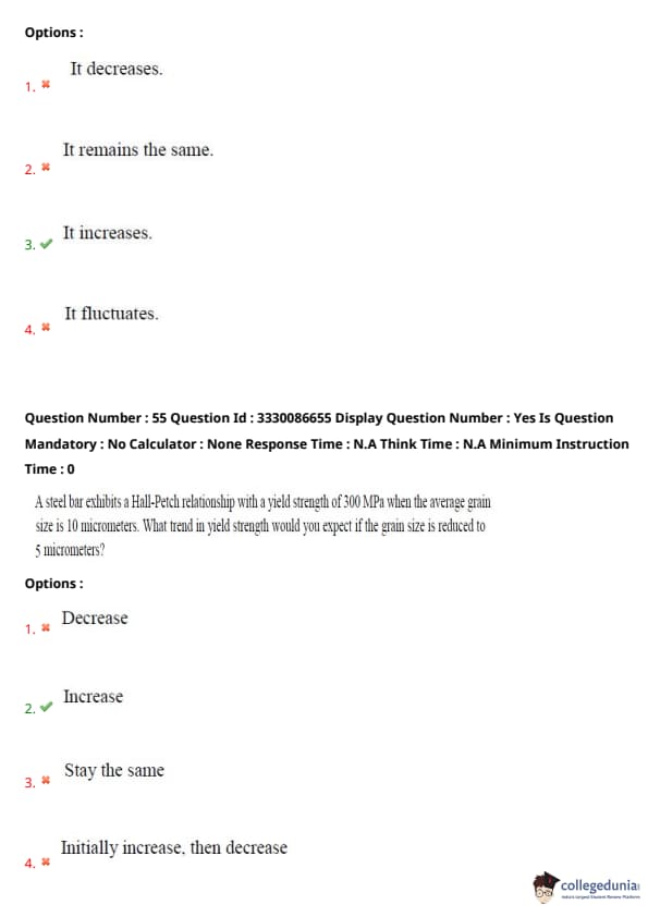 Question 55: A steel bar exhibits a Hall-Petch relationship with a yield strength of 300 MPa when the average grain size is 10 micrometers. What trend in yield strength would you expect if the grain size is reduced to 5 micrometers?