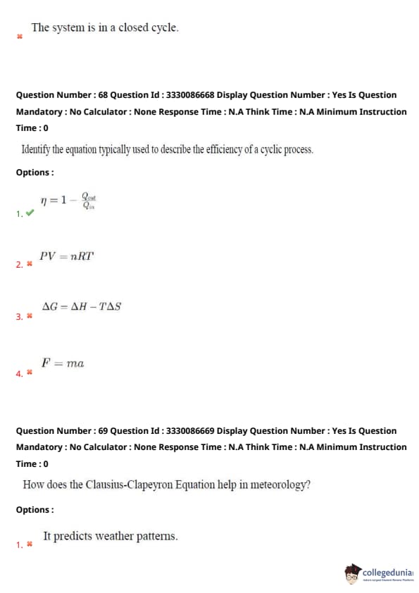 Question 68: Identify the equation typically used to describe the efficiency of a cyclic process.